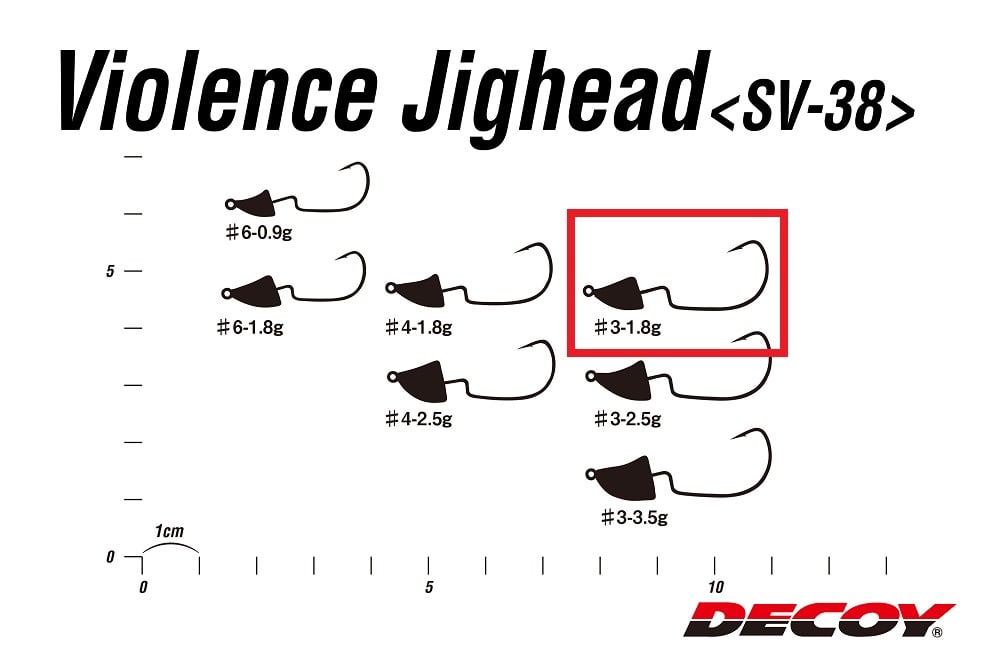SV-38, maksimum 3 inç'e (7,5cm) kadar küçük yemler için tasarlanmış hassas bir jig başlığıdır. Jig başlığı ve geniş aralıklı kancanın kombinasyonu, kancanın ucu yumuşak yemin arkasına dayandığı için, takılma potansiyeli yüksek su alanlarında yem kaybını önleyerek balık avlamayı mümkün kılar. Sivri uçlu kafa tasarımı, kamışın hafif vuruşlarıyla çekildiğinde yemin zikzak bir hareket yapmasını sağlar; bu özellikle shad modeli gibi belirgindir.